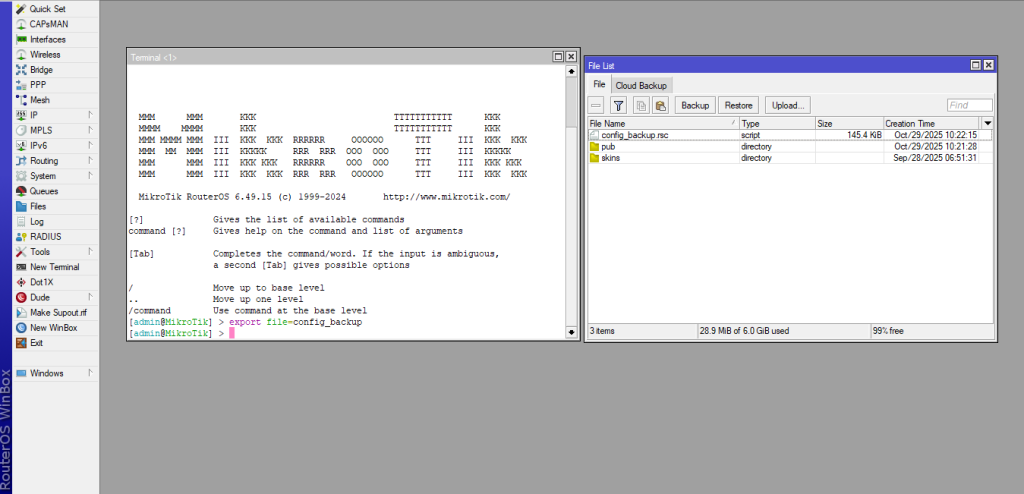 export file=config_backupو فایل متنی با نام config_backup.rsc در مسیر Files ذخیره میشود.
